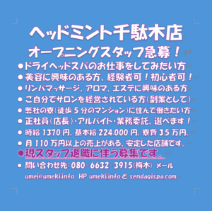 Youtube 出演しています! 現在、求人しています! AirWORK(こちらからお申し込みください。) 求人のページ ヘッドミント千駄木店正社員数名 ヘッドミント千駄木店パート数名 ヘッドミント仙台東口店パート1名 事業内容 リラクゼーションサロン(ヘッドミント千駄木、仙台東口) 宿泊業(ペンション銀河) 尾瀬高校ホームステイ(ペンション宇宙) 駐車場経営(越生one day park,栗橋one day park) 幼児教室(コペル江戸川橋、千駄木)は終了しました。 https://youtu.be/CigeFjpTj3Y?si=o2CYCIY_-mE1MIgq https://youtu.be/KyK6qfRgbM8?si=9Cxlcb29Yqz5mija https://youtu.be/LahX_r-ZR6I?si=zt0TorBauI85yO5r https://youtu.be/QBaVimYqN1s?si=zt88A7Mt69ZEupKJ